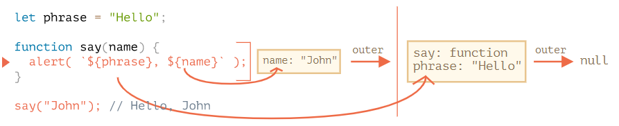 - 함수 say 내부의 alert에서 변수 name에 접근할 땐, 먼저 내부 렉시컬 환경을 살펴본다. (변수 name을 찾음)
