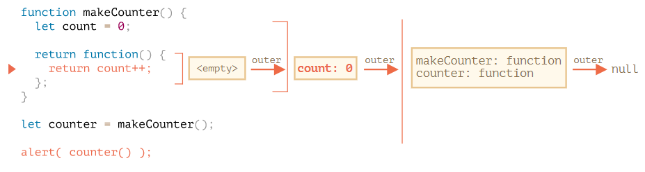 ◾️ makeCounter()가 실행되는 도중에 한줄짜리 본문을 가진 중첩 함수가 만들어진다. (중첩함수가 생성되기만 하고 실행은 되지 않은 상태)