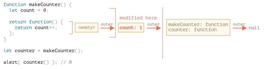 ◾️ makeCounter()를 호출하면 호출할 때마다 새로운 렉시컬 환경 객체가 만들어진다. 그리고 이 렉시컬 환경 객체에는 makeCounter를 실행하는데 필요한 변수들이 저장된다.