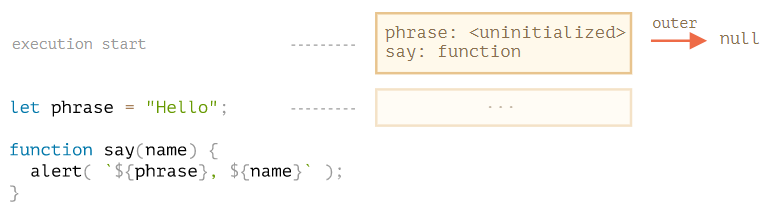 - 외부 렉시컬 환경은 전역 렉시컬 환경이다. 전역 렉시컬 환경은 phrase와 함수say를 프로퍼티로 갖는다.